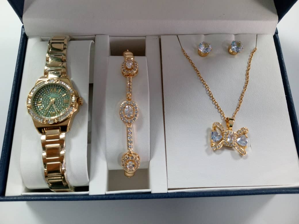 WOMEN’S GOLD-TONE QUARTZ WATCH AND JEWELRY GIFT SET